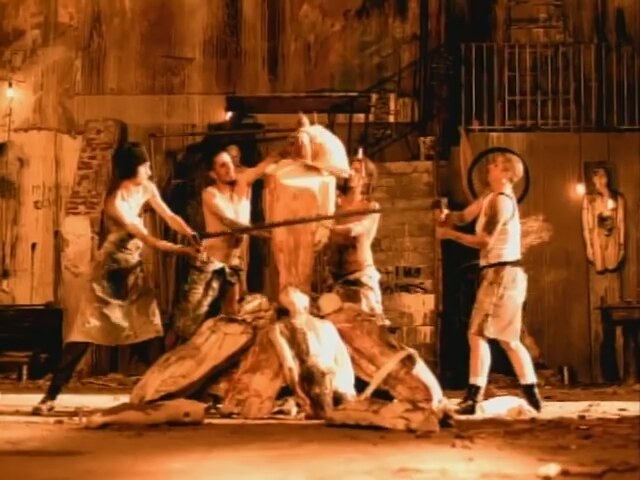 Parallèlement, Bowie fait les mêmes choses : jouer avec le mannequin, le désarticuler, s'enduire d'un bain, tracer de la peinture sur son visage. Parfois, le mannequin est sans tête, parfois il la garde, parfois Bowie la met à l'envers sur le haut du corps. La peinture rouge ou le sang la recouvre parfois – de même que Bowie s'agite parfois sur scène avec un T-shirt rouge, de même que le mannequin charcuté par les jeunes artistes devient parfois presque entièrement rouge.